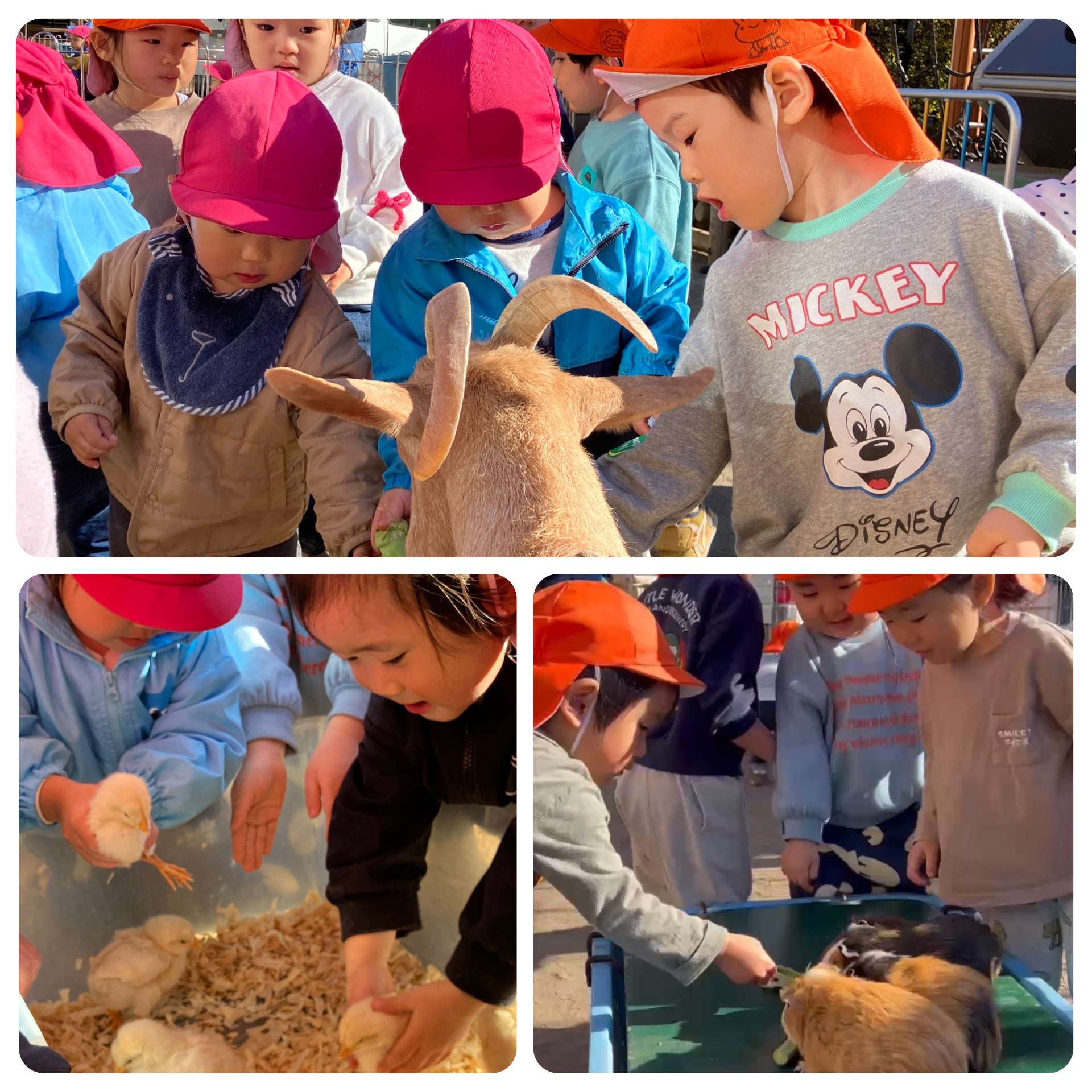 12月12日に動物村がありました。ひよこ、モルモット、うさぎ、ヤギなどと触れ合ったり、人参やキャベツをあげました。最初は、恐る恐る触れてみる子もいましたが、みんな最後には楽しんでいました。