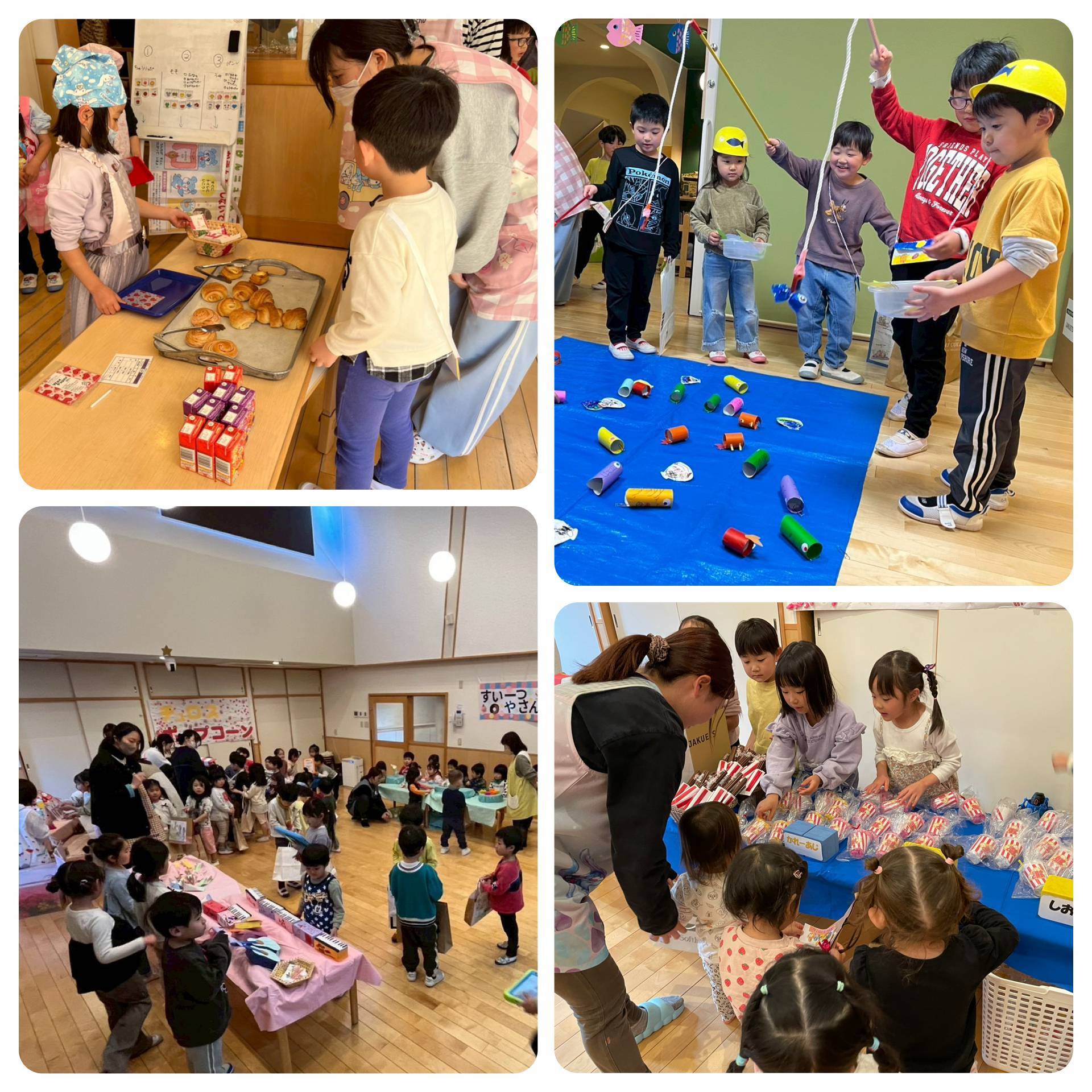 1月29日、30日にお店屋さんごっこがありました。2歳児と幼児さんがお店屋さんになって「いらっしゃいませー」と元気な声が響き渡る中、お店屋さんが開店しました。売り込みもとっても上手で色々買いたくなってしまうほどでした。乳児さんは、色々な品物を目の前にしてあれこれ迷いながらも好きな物を選んで楽しんでいました。